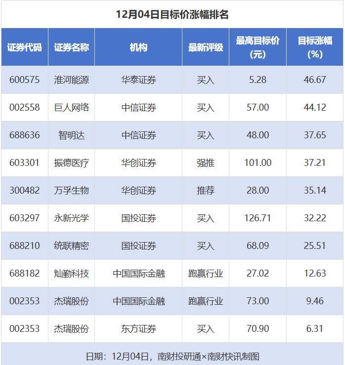 南财投研通数据显示策略红,12月4日,券商给予上市公司目标价共10次,按最新收盘价计算,目标价涨幅排名居前的公司有淮河能源、巨人网络、智明达,目标价涨幅分别为46.67%、44.12%、37.65%,分别属于煤炭开采、游戏、军工电子行业。