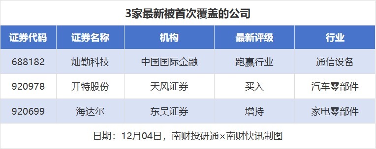 首次覆盖方面,12月4日券商共给出了3次首次覆盖策略红,其中灿勤科技获得中国国际金融给予“跑赢行业”评级,开特股份获得天风证券给予“买入”评级,海达尔获得东吴证券给予“增持”评级。