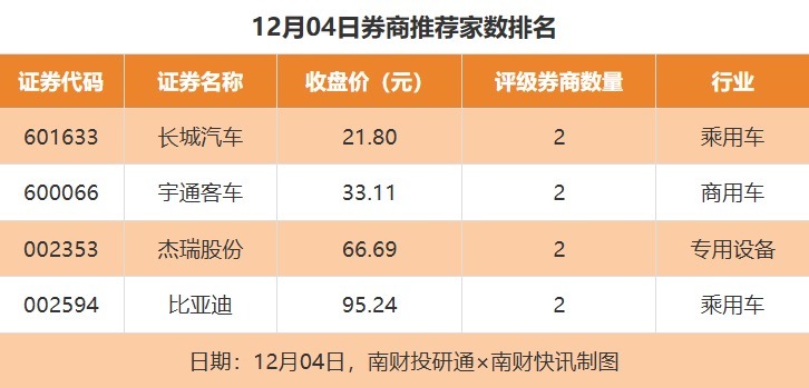 从券商推荐家数来看,12月4日有17家上市公司得到券商推荐策略红,其中长城汽车、宇通客车、杰瑞股份、比亚迪均获得2家推荐。