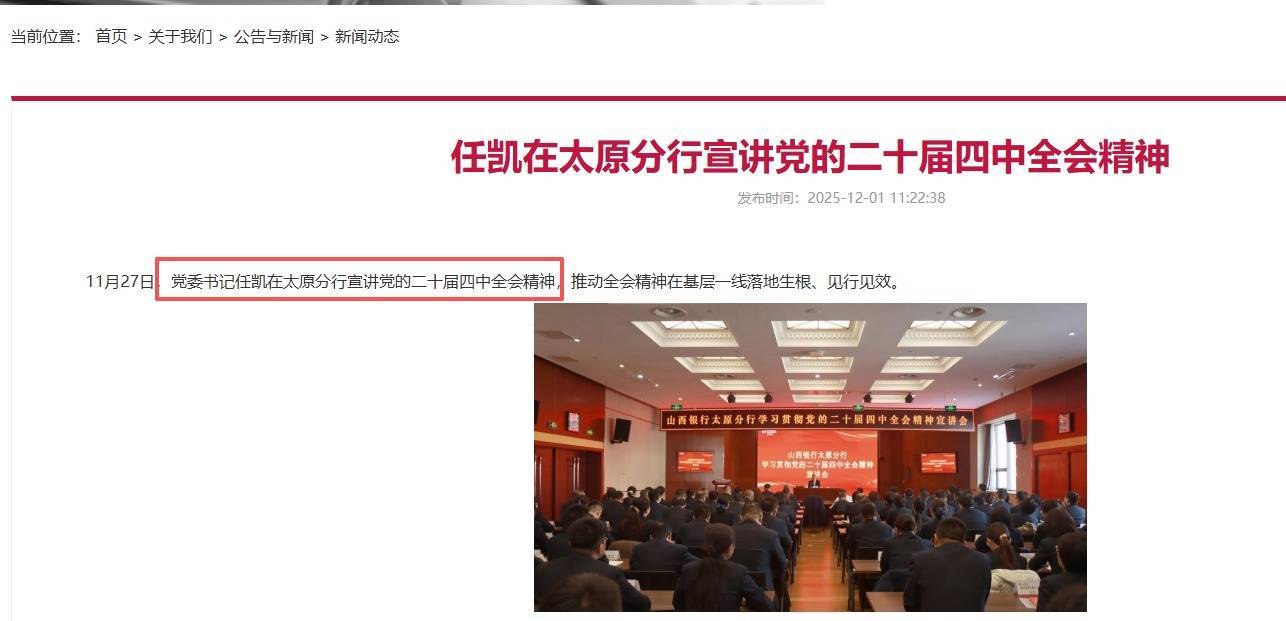 值得注意的是,山西银行12月1日发布了题为《任凯在太原分行宣讲党的二十届四中全会精神》的文章,其中,任凯以该行党委书记的职务出现。